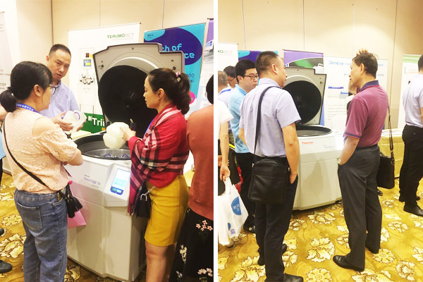 ThermoFisher Scientific 公司的大容量離心機在血站系統(tǒng)一直有著質(zhì)量可靠、離心產(chǎn)率高的美譽。本次盛會我們展示了ThermoFisher Heraeus Cryofuge 8 & 16大容量血站離心機樣機。該離心機以增大的16×500 mL血袋處理能力和友好的用戶設計來滿足血站的需求,使得大體積樣品離心更容易、更便捷。其軟件系統(tǒng)具有實驗方案自動轉(zhuǎn)化功能,能夠直接使用客戶現(xiàn)在的離心方法,減少了方法轉(zhuǎn)換帶來的繁瑣步驟。同時,增強的人機工效、結(jié)構(gòu)緊湊的設計,融入快速運行設定、可追溯數(shù)據(jù)管理、高度實驗重現(xiàn)性等功能,滿足血站大容量離心的人性化、智能化需求??芍^是為血站大容量離心量身定制的一款產(chǎn)品。在茶歇期間,很多血站機構(gòu)的專家領導都過來我們展位參觀咨詢。我們的李總及工程部、市場部和深圳辦同事們都熱情接待并詳細講解。