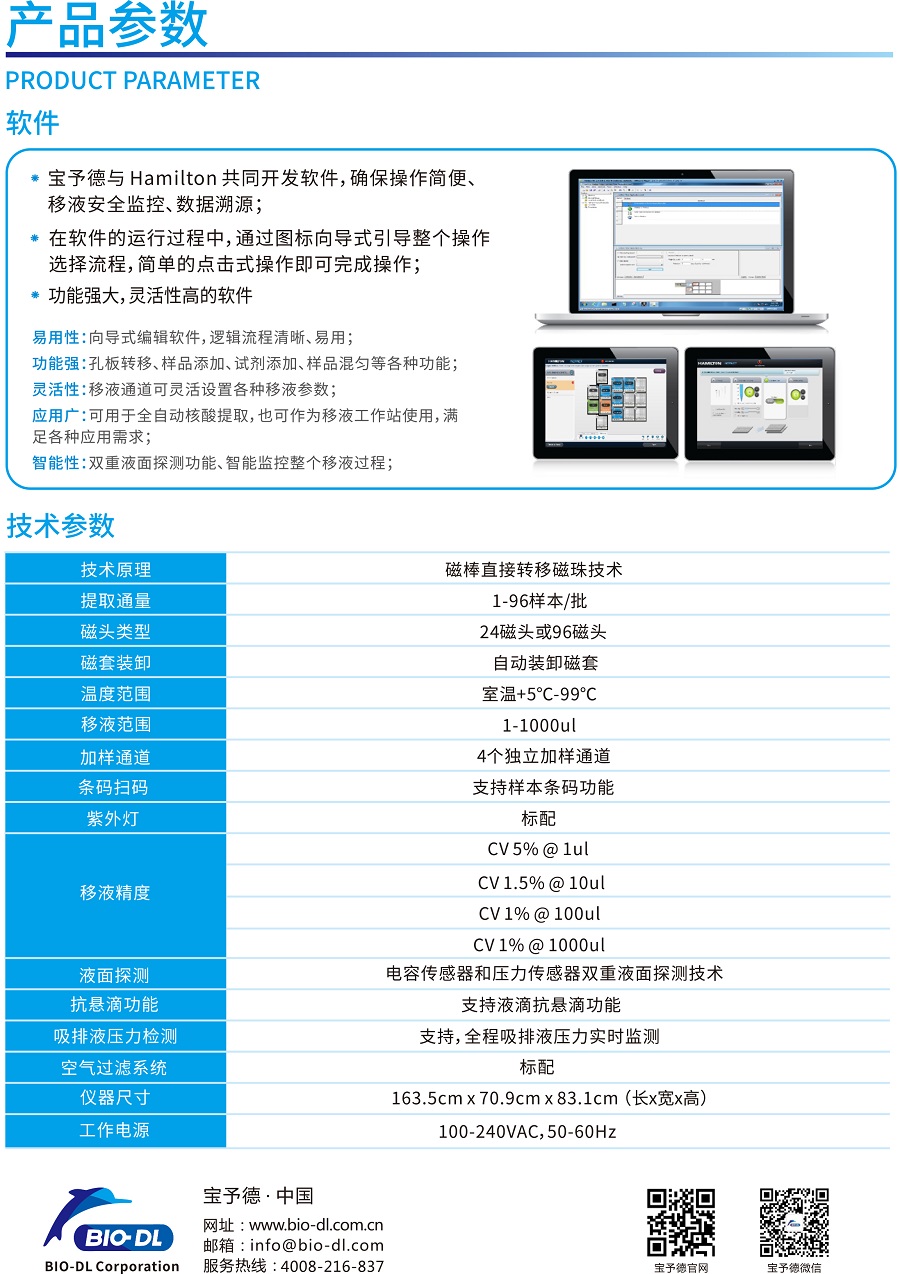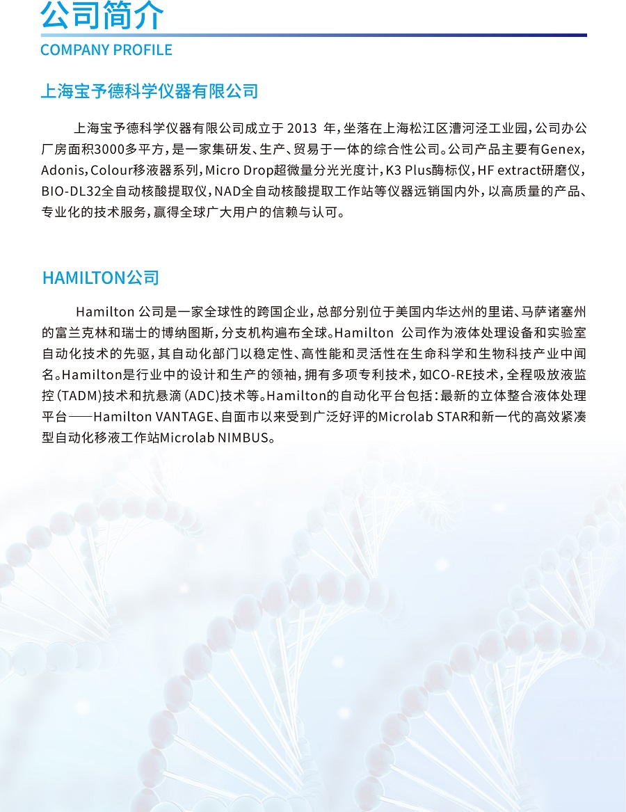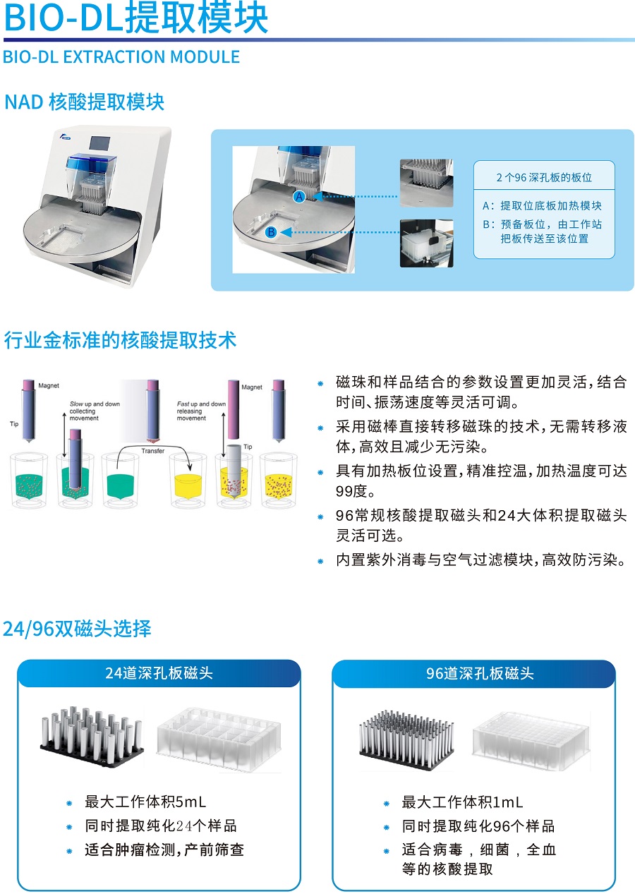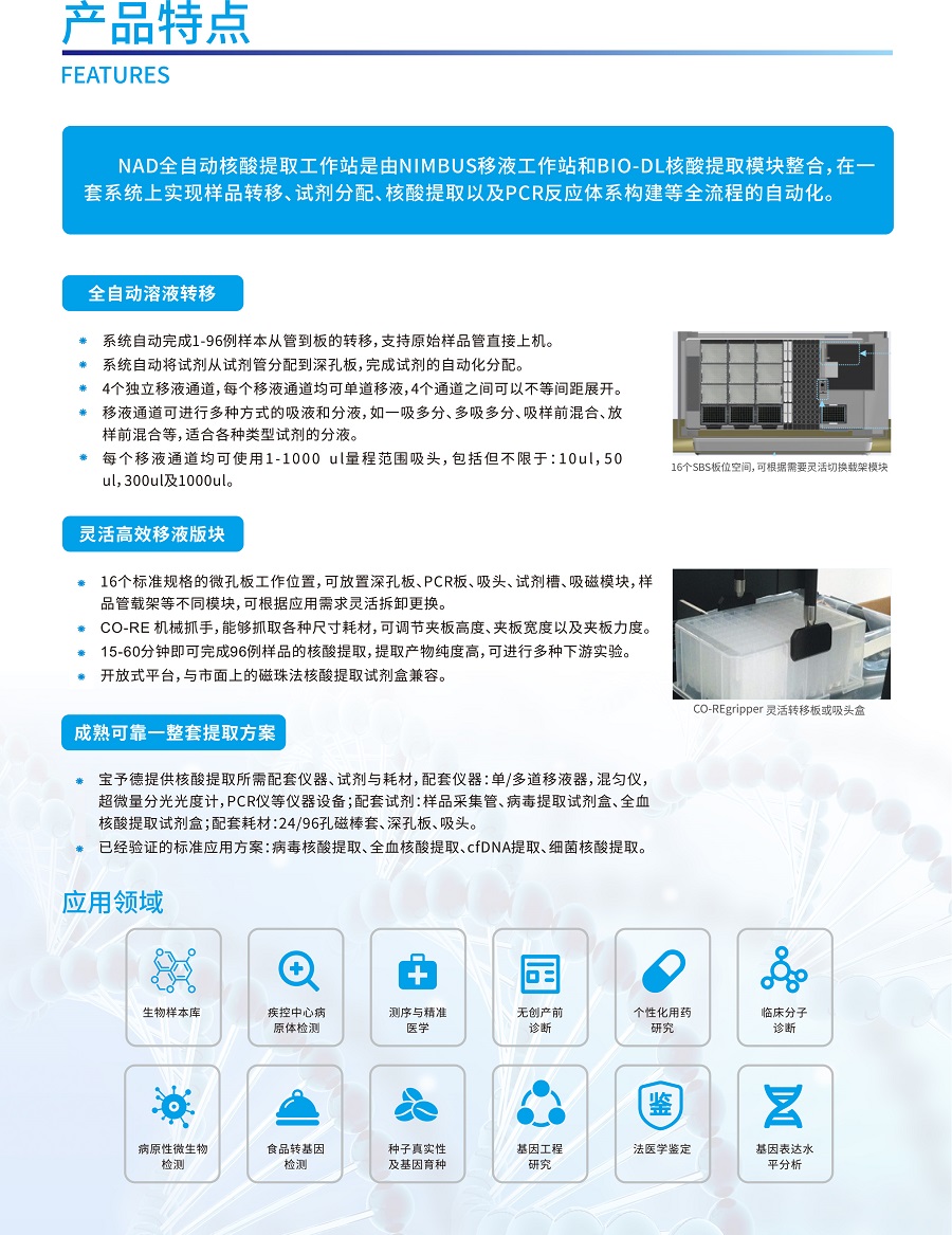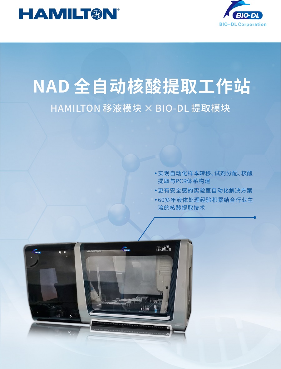 實現自動化樣本轉移、試劑分配、核酸提取與PCR體系構建;更有安全感的實驗室自動化解決方案;60多年液體處理經驗積累結合行業(yè)主流的核酸提取技術; NAD全自動核酸提取工作站是由NIMBUS移液工作站和BIO-DL核酸提取模塊整合,在一套系統(tǒng)上實現樣品轉移、試劑分配、核酸提取以及PCR反應體系構建等全流程的自動化。