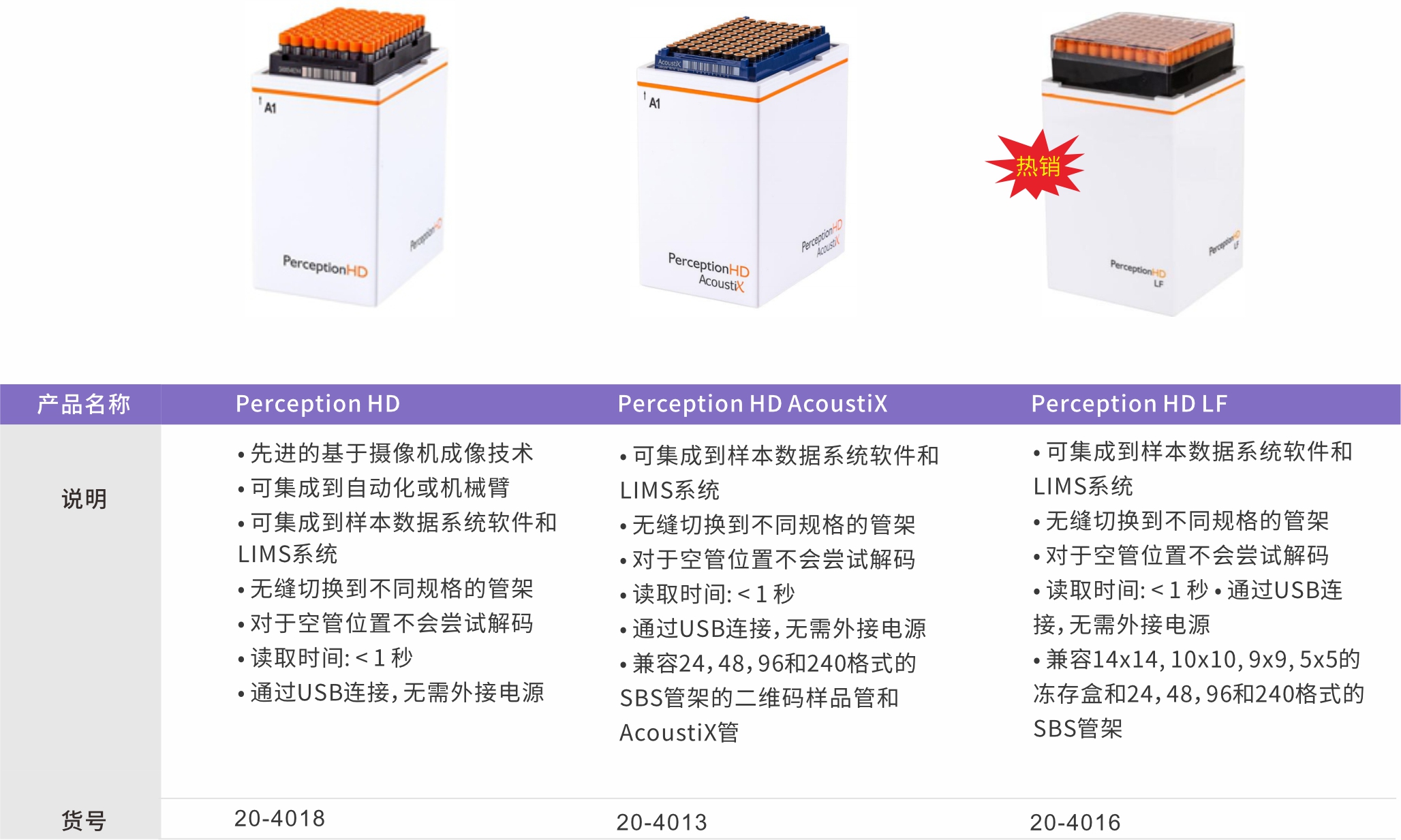 Perception 可快速識(shí)別SBS的管架以及二維碼樣品管,無(wú)需將樣品管從管家上取出即可實(shí)現(xiàn)整版樣品管信息的讀取。該系列讀碼儀不僅可讀取Azenta生產(chǎn)的二維碼樣品管,還可讀取目前市場(chǎng)上所有的二維碼樣品管。可提供三種型號(hào):Perception HD適用于整版SBS格式的管架樣品管掃碼;Perception HD LF適用于整版SBS格式的樣品管和凍存盒格式樣品管的掃碼;Perception HD AcoustiX適用于AcoustiX聲控微量?jī)龃婀艿恼鎾叽a。