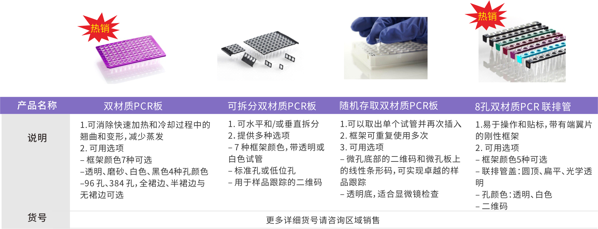 FrameStar®PCR板通過最大程度減小PCR管受熱膨脹來防止樣品損失,從而可選擇更小的實驗體積,節(jié)約試劑成本。雙組分設計融合了薄壁聚丙烯管(PP)的優(yōu)點從而可獲得最佳的PCR結果,同時剛性聚碳酸酯(PC)裙邊和框架提供最好的熱穩(wěn)定性和剛性,雙組分PCR板是自動化操作的首選。