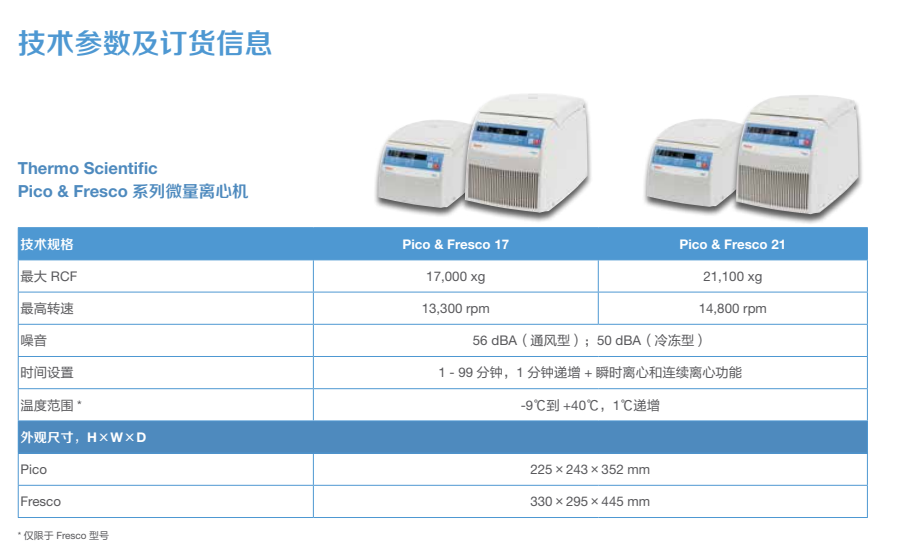 計。其結構精巧、使用方便,同時兼具卓越的產(chǎn)品安全性。Pico® 系列為通風型,F(xiàn)resco® 系列為冷凍型,可為您的微量樣品提供快速、安全、有效的分離。其離心容量可滿足通常實驗室的通量要求。無碳刷電機實現(xiàn)寧靜、無震動運轉;